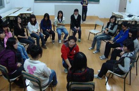 8名学员围成一个向心圆,双掌向前推,草(一位学员)则站在圆中央。